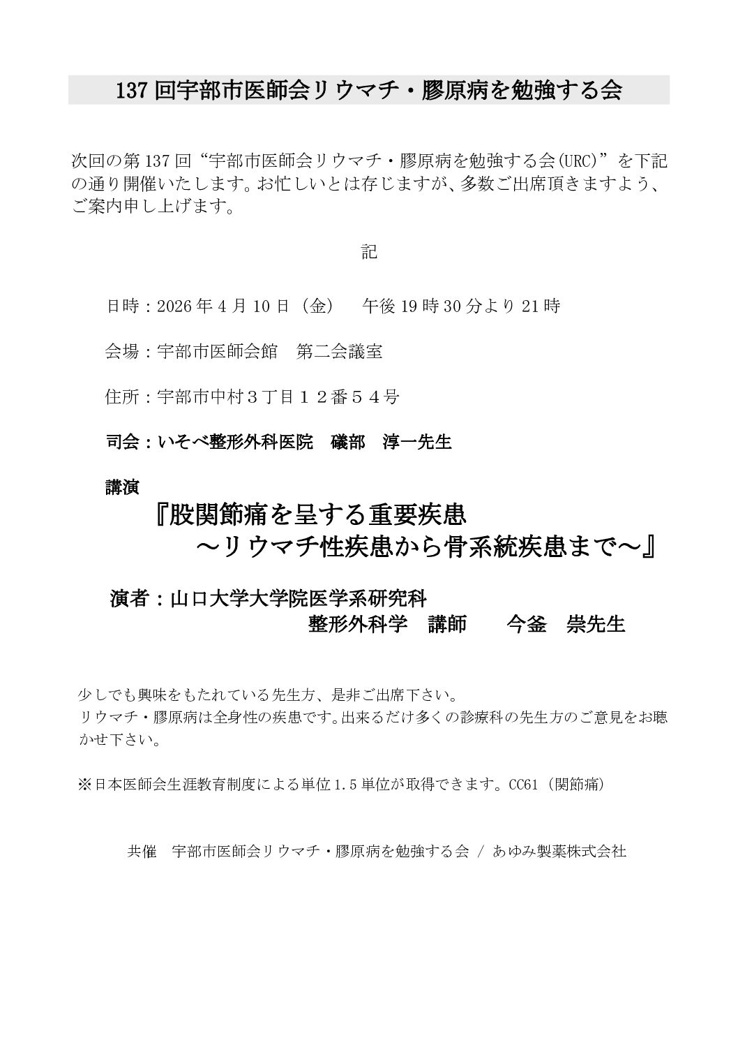 『 股関節痛を呈する重要疾患~リウマチ性疾患から骨系統疾患まで~ 』 山口大学大学院医学系研究科 整形外科学 講師 今釜 祟 先生